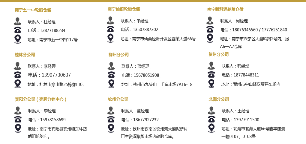 本公司是廣西區(qū)內的輪胎批發(fā)及零售商,獨家代理世界及國內眾多知名品牌輪胎:德國大陸馬牌輪胎(世界第四品牌),美國庫珀輪胎(世界第八品牌)杭州中策朝陽(中國第一品牌),杭州中策好運(中國第二品牌),無錫紅豆、赤兔馬、千里馬,等品牌。在廣西區(qū)內有眾多集團客戶,主要為中國鋁業(yè)股份有限公司平果分公司、廣西晟宇通物流有限公司、南寧市平樂行物流有限公司、柳州恒達巴士股份有限公司、廣西欽州國際集裝箱碼頭有限公司、廣西盛達混凝土有限公司、火車站物流車隊、區(qū)內部分快運車隊等的輪胎專用供應商。多年以來,被南寧市工商局授予“誠信?維權承諾單位”、“消費者信得過單位”以及“南寧市第一次全國經濟普查先進集體單位”。